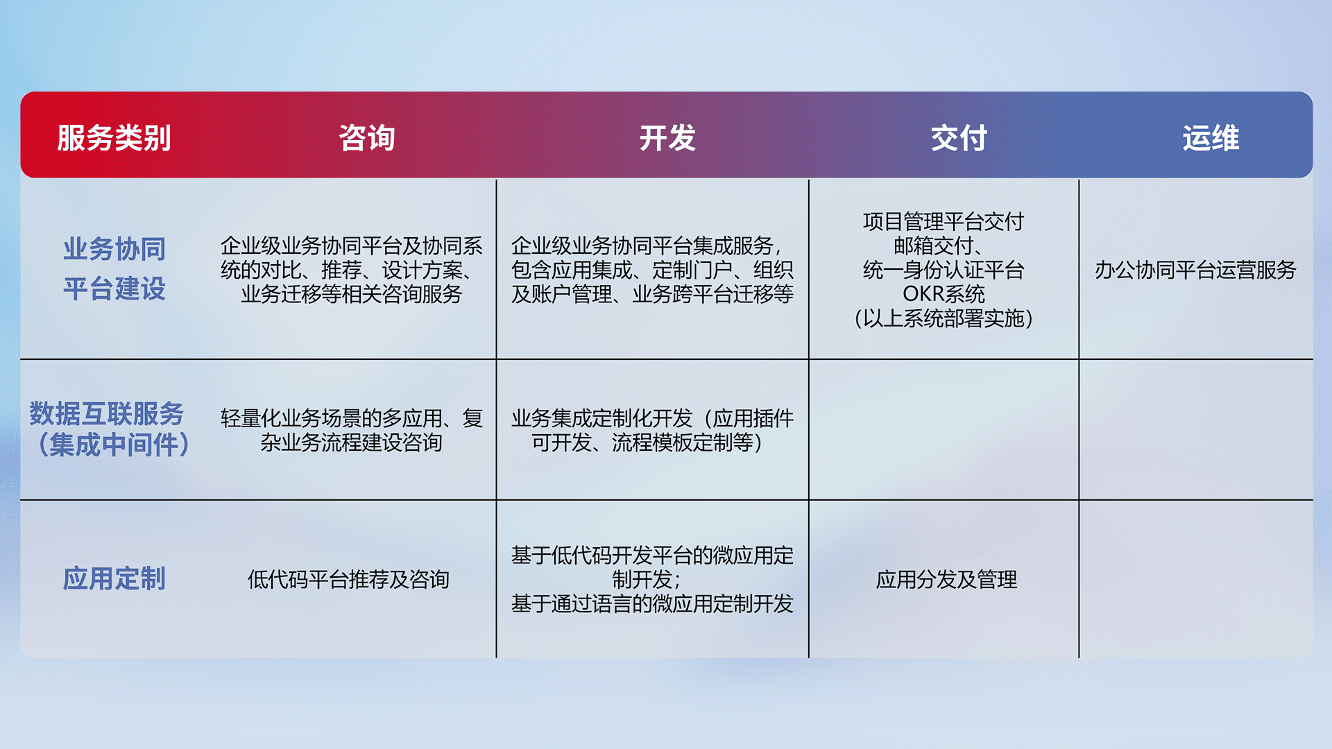 针对钉钉、、企微、、、IDaas等平台级产品提供产品的规划、、方案、、、交付、、、定制化开发等服务,,,,实现如统一协同办公、、、、智能客户服务、、混合会议管理、、、智能数据查询、、等业务场景,,实现数字化转型。。。